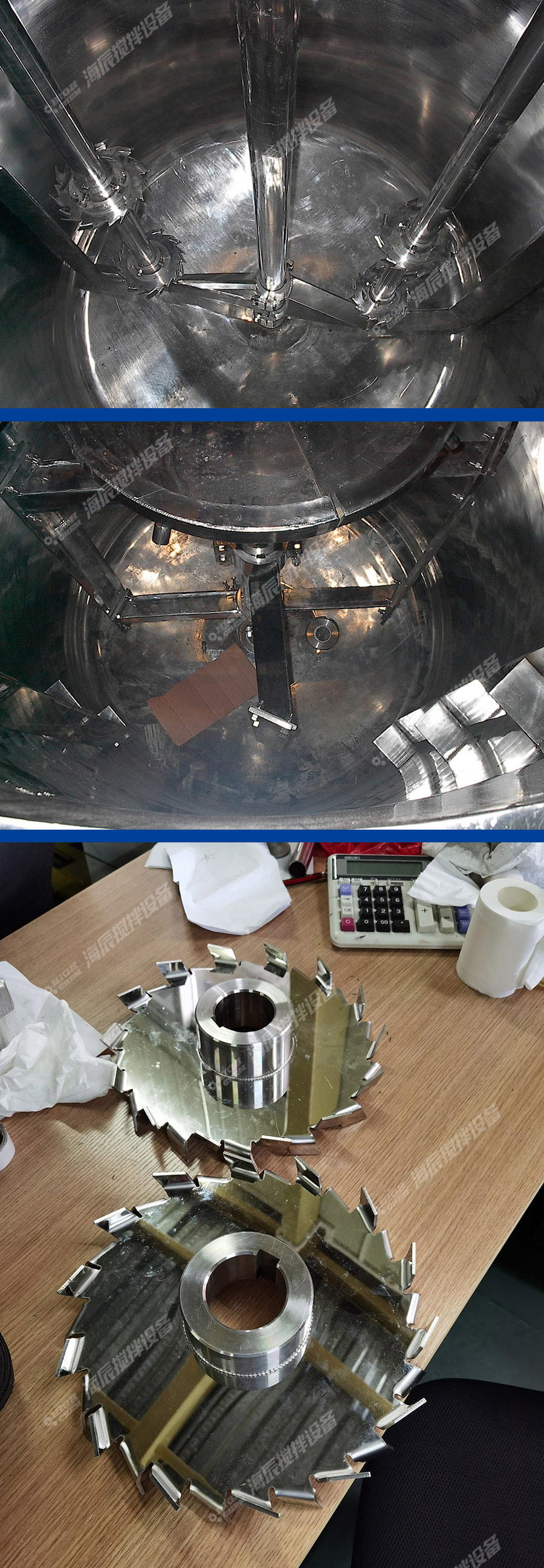 物料在鋸齒狀圓形分散盤葉片的高速轉(zhuǎn)動作用下,在容器內(nèi)上下劇烈翻動,與葉片及其他物料分子產(chǎn)生碰撞和剪切,使聚集體達(dá)到迅速分散,均質(zhì)混合乳化,加速溶解。
